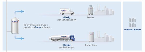 La possibilité la plus économique de livrer des quantités moyennes à grandes est l'approvisionnement par camion-citerne. Messer exploite une flotte de semi-remorques ou de conteneurs spéciaux pour les gaz cryogéniques comme l'azote, l'oxygène, l'argon, le dioxyde de carbone ou l'hélium. Ces gaz sont livrés sous forme liquide, car le volume de stockage nécessaire est nettement moins important qu'à l'état gazeux.