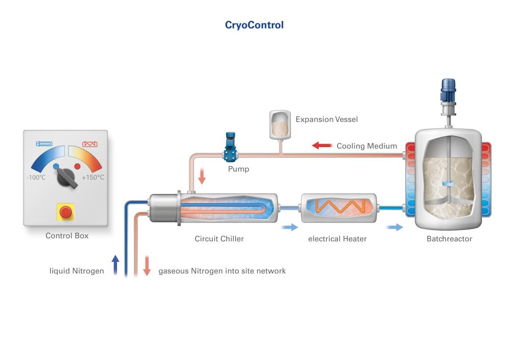Die kryogene Kühlung nutzt die Kälteenergie des flüssigen Stickstoffs. Das Verfahrensprinzip ist einfach, aber effizient: Zwischen die Kältequelle Stickstoff und den Reaktor wird ein cryo Kühler mit einem sekundären Wärmeträgerkreislauf geschaltet. Dieser Wärmekreislauf ermöglicht sowohl das Kühlen als auch das Beheizen des Reaktors. Im Kühlmodus wird der Wärmeträgerkreislauf mit flüssigem Stickstoff im cryo Kühler gekühlt. Anschließend steht der Stickstoff für weitere Anwendungen gasförmig zur Verfügung, z. B. für die Inertisierung. Durch die geringe Temperaturdifferenz während der kryogenen Kühlung zwischen Kühlmedium und Produkt wird der Reaktorinhalt sehr schonend und gleichmäßig temperiert. So ist auch die Synthese von temperaturempfindlichen Produkten möglich.